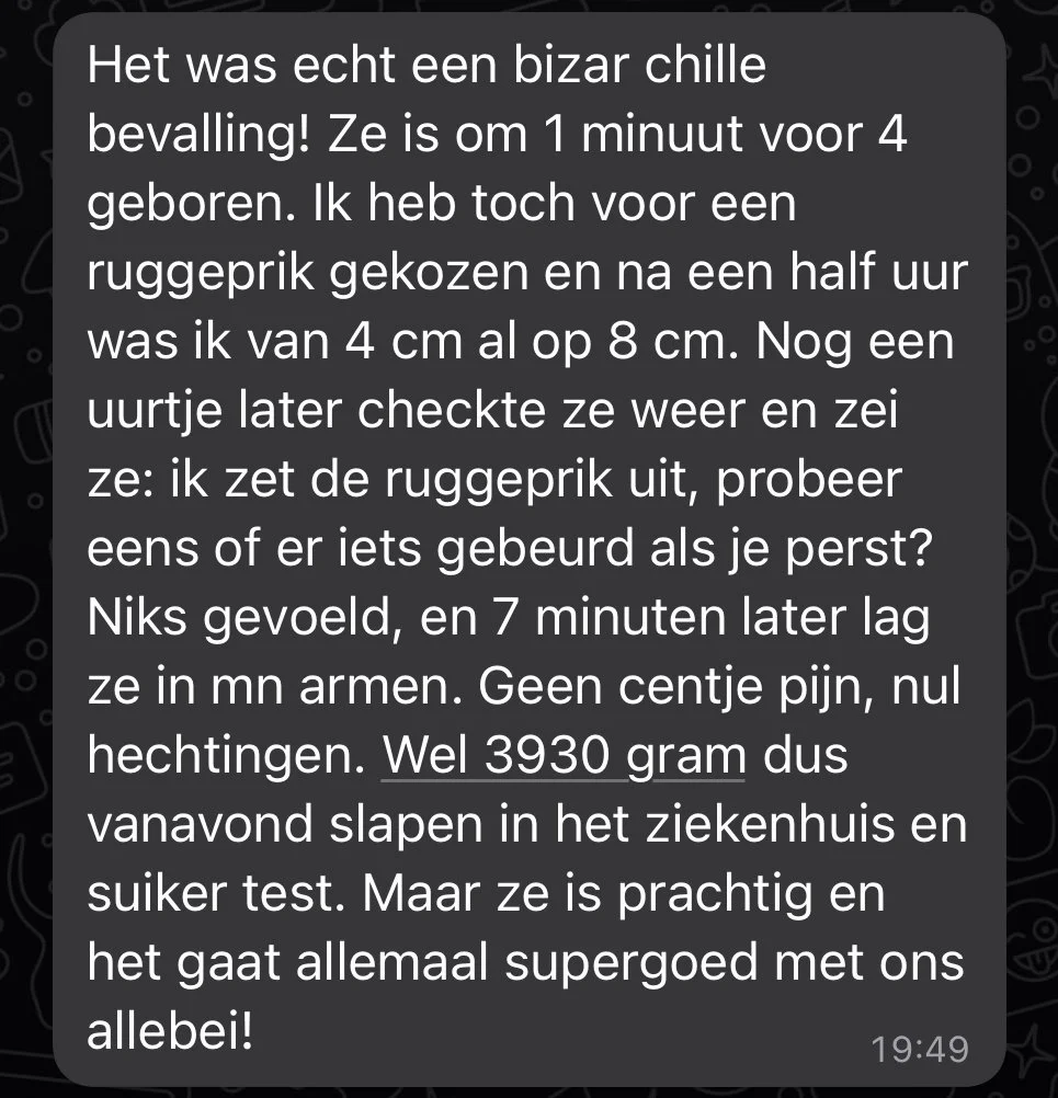 Maar - wat ben ik blij dat ik dit allemaal gedaan heb. Waar ik na mijn eerste bevalling totaal ondersteboven was van hoe mis het was gegaan, voelde ik na de tweede keer: ‘als ik dit kan, kan ik alles!’. En dát gevoel… dat neem ik de rest van mijn leven met me mee.